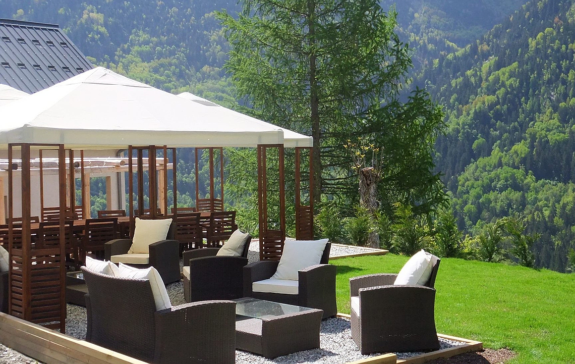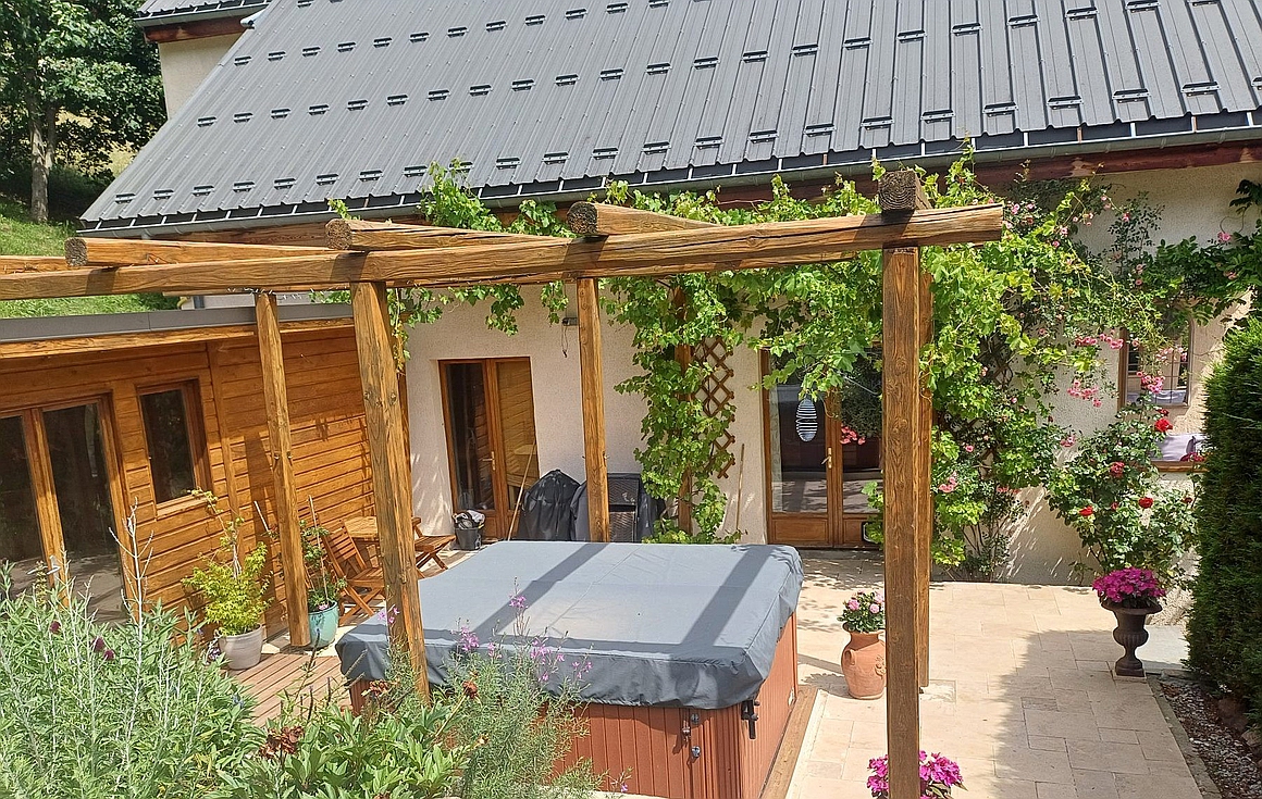 The chalet also enjoys a delightful, bright and airy living room of 60m2 as well as a fully equipped professional kitchen. Outside, here you will find a jacuzzi, sauna, terrace and garden.