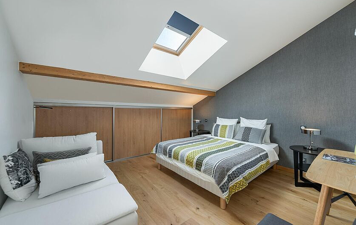 Designed to accommodate up to 10 guests in comfort, the property features a master bedroom with an en-suite bathroom, a double bedroom with a single bed, and an expansive family room for up to 6 guests, also with an en-suite bathroom. Natural light floods the living room, enhanced by a fully glazed gable that seamlessly connects the indoors with the outdoors. The open-plan kitchen and dining area create the perfect space for sharing moments with loved ones.