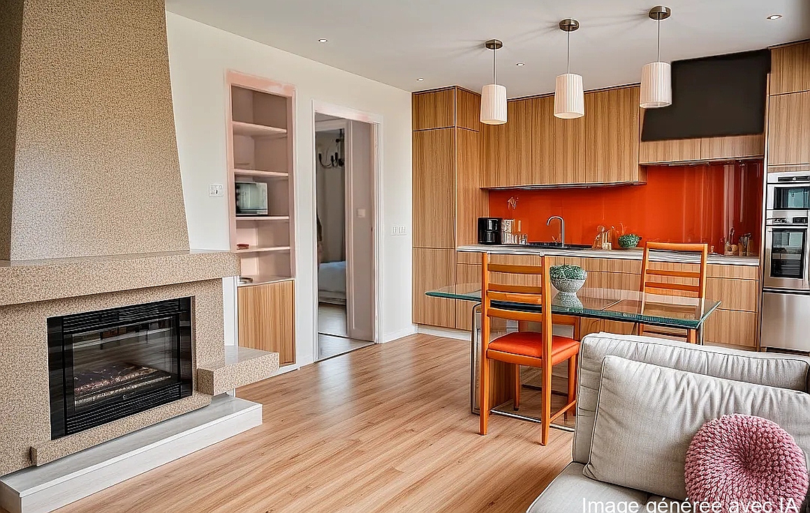 This apartment, in need of renovation, is situated within a small, intimate condominium of just 16 units, offering excellent potential for customization. The spacious layout includes a large entrance hall, a living room with a cozy fireplace that opens onto a balcony, and an open-plan kitchen, making it an inviting space for entertaining or relaxing. The two bedrooms share a bathroom and shower room, with a separate WC adding convenience.