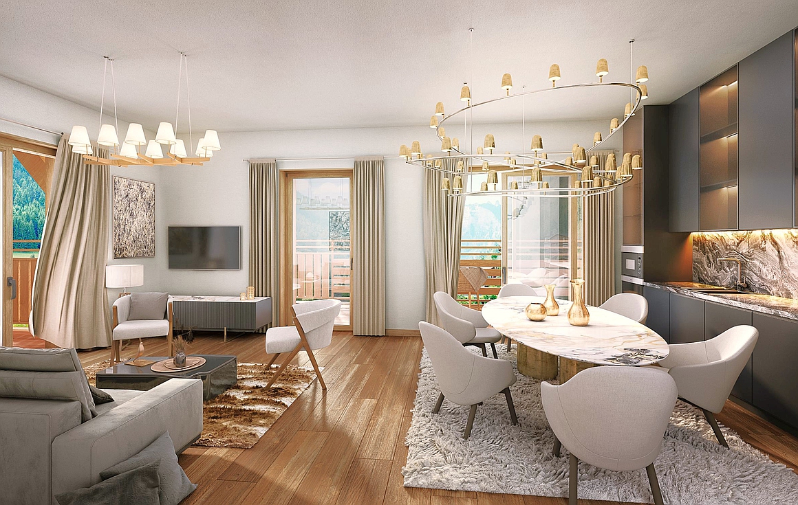 Enjoying a spacious 65m2 living triple aspect living area to give a light and airy interior space, the apartment comes with ski locker, private cave and garage parking.