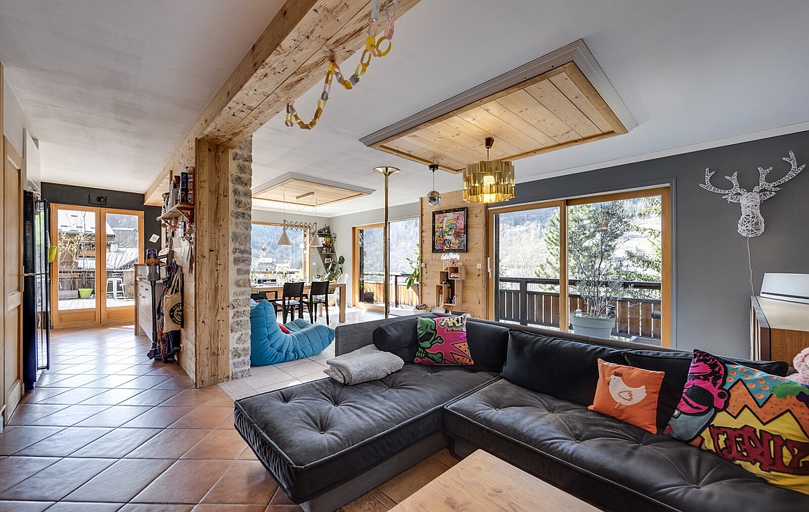 The heart of the chalet is a spacious open-plan living area with a feature fireplace and fully fitted kitchen, opening onto a generous terrace — the perfect spot to soak in panoramic views of snow-dusted peaks. The main accommodation includes two bright double bedrooms, one en-suite, a stylish family bathroom, and an alcove converted into an additional sleeping area. A separate entrance leads to two fully self-contained studios, ideal for guests, staff, or generating seasonal rental income.
