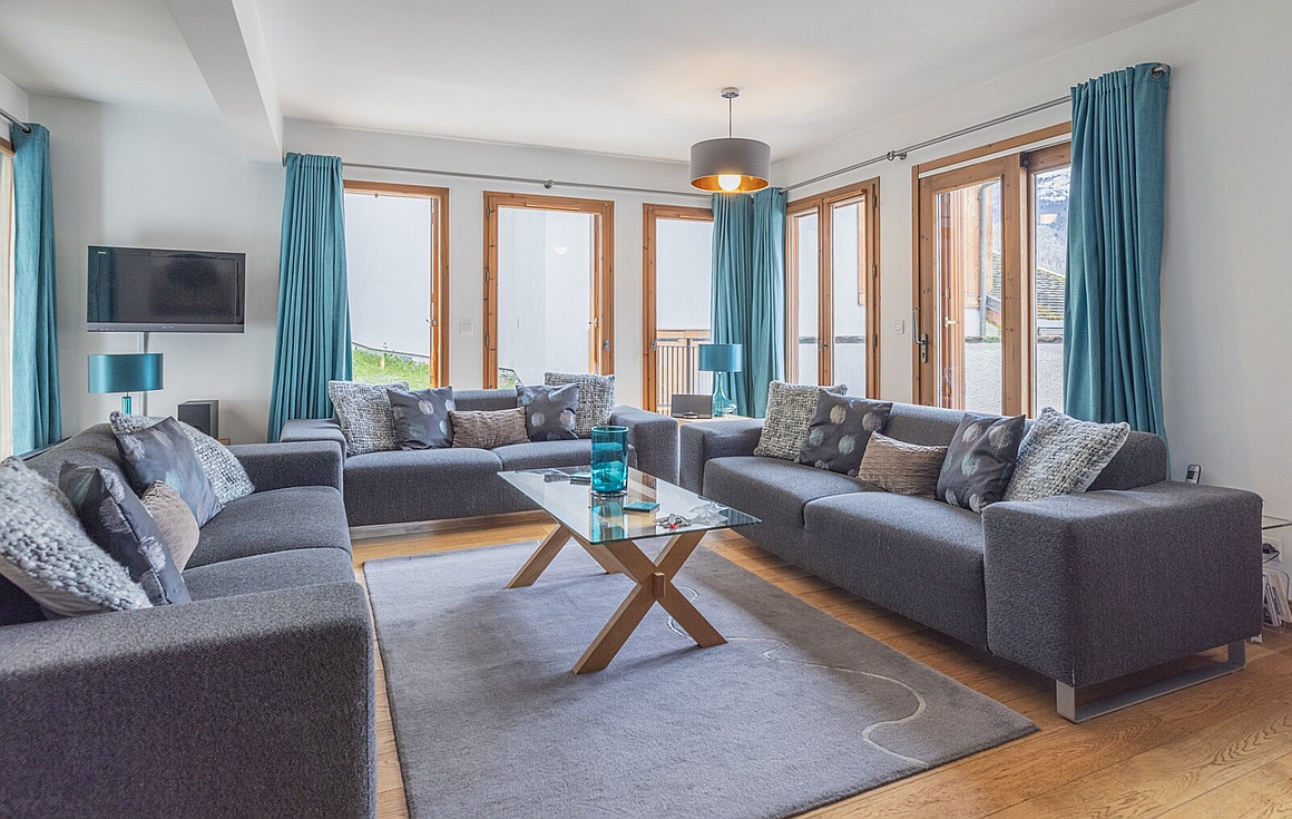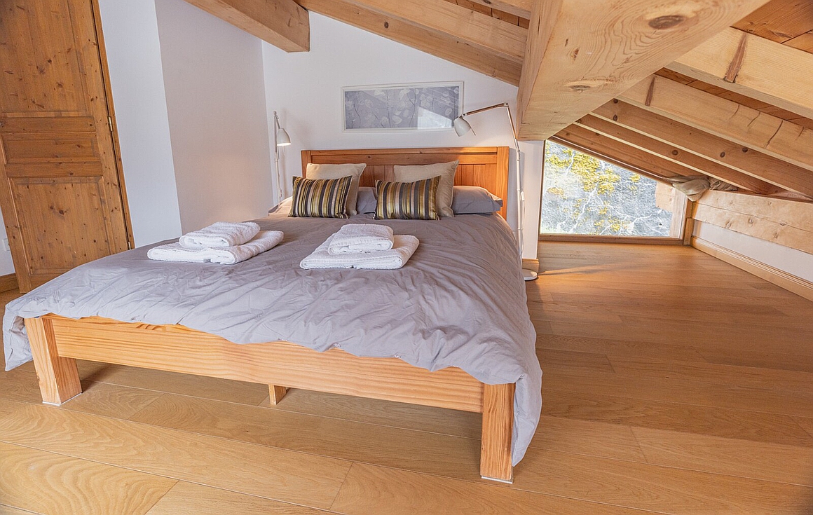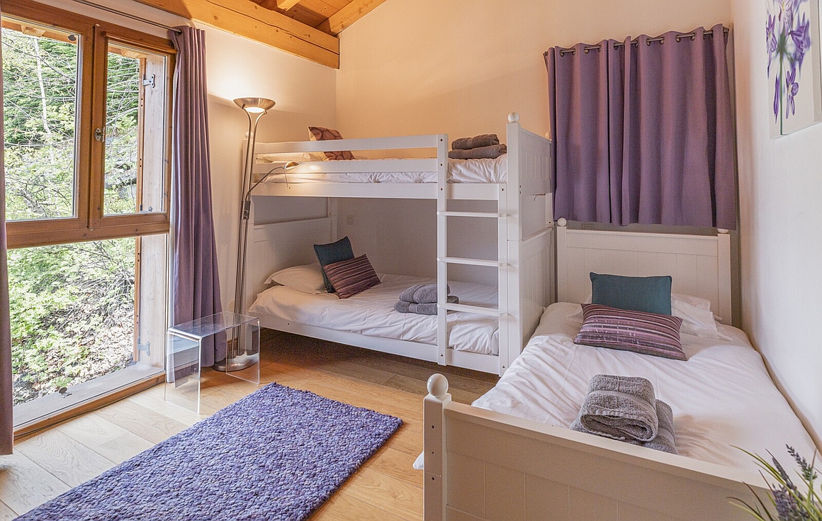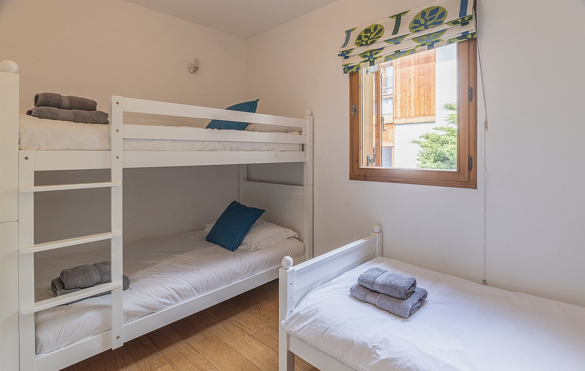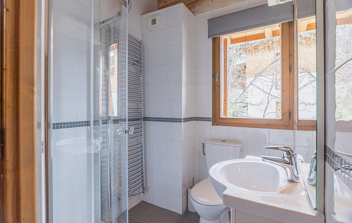 The first floor hosts a spacious, light-filled living area wrapped around a striking 360-degree wood-burning stove. A sleek open-plan kitchen and lounge flow seamlessly onto a west-facing terrace—ideal for sun-soaked afternoons or al fresco dining with views over Saint-Martin. The ground level is equally inviting, with a games or TV room, a practical cabin area with shower room, utility room, and a generous double garage. Upstairs, two bedrooms, a family bathroom, and the en suite master bedroom enjoy uninterrupted alpine panoramas.