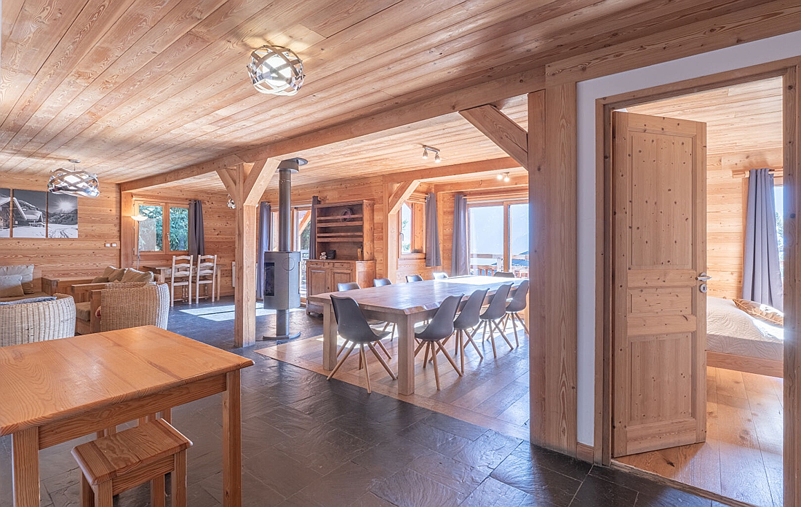 With exposed wood beams, open-plan living, and expansive balconies, this chalet embodies the perfect fusion of traditional charm and modern comfort. From morning coffee on the sun-drenched terrace to cosy evenings in the wood-accented living room, every space has been thoughtfully designed to enrich your lifestyle. The generous dining area is perfect for hosting, while the fully equipped kitchen offers sleek practicality for all-season living.