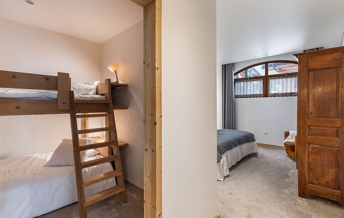This apartment features five bedrooms, including an en-suite master bedroom, a family bedroom, and multiple bathrooms with four showers and one bathtub. The open-plan living and dining area with its fully equipped kitchen is perfect for hosting gatherings and enjoying quality time. A spacious terrace extends the living area, offering panoramic views of the surrounding mountains.