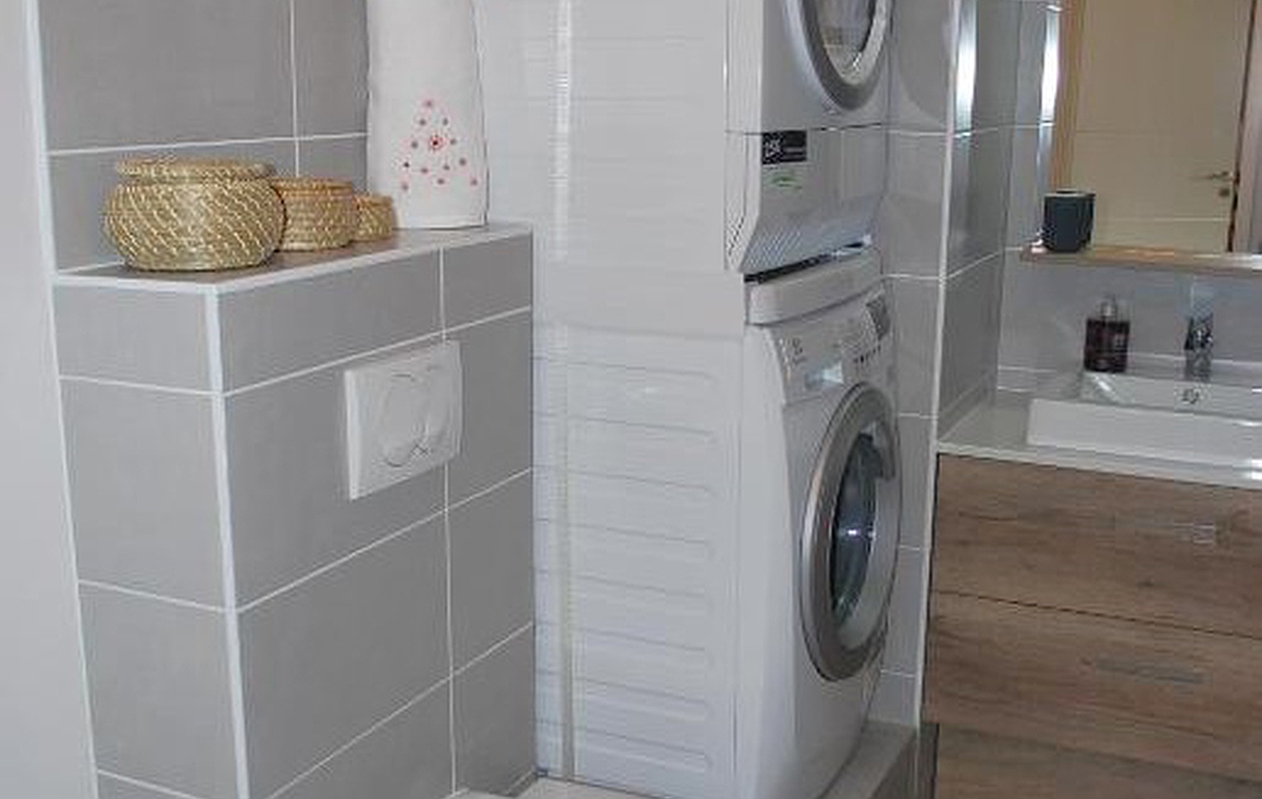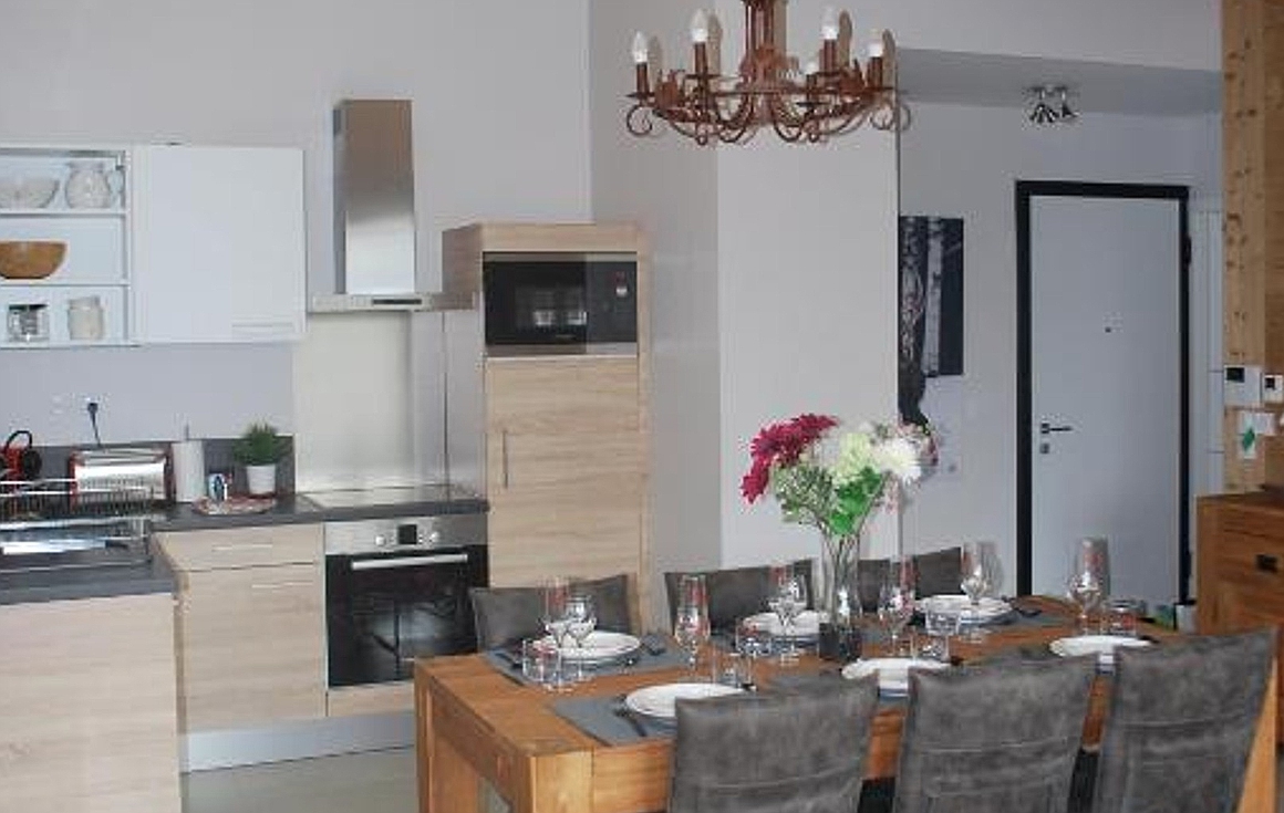 Found within a modern building completed in 2017 by a well known developer of the region, the warm atmosphere in the apartment enjoys a28m2 open plan living area under a vaulted wooden cathedral ceiling with fully fitted kitchen, dining area area and living room with access to the large balcony.