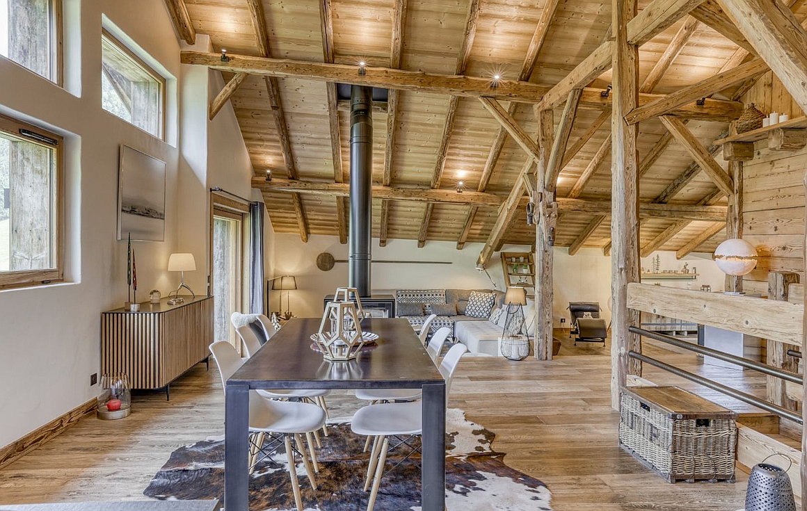 Dating back to 1850, the farmhouse has been meticulously restored across two levels, preserving its original character while enhancing comfort with high-end contemporary finishes. High ceilings, exposed beams, and generous volumes create an elegant and warm atmosphere, while the double-sided fireplace brings a welcoming mountain spirit to the living spaces. The property is sold fully furnished with carefully selected pieces that elevate its charm.