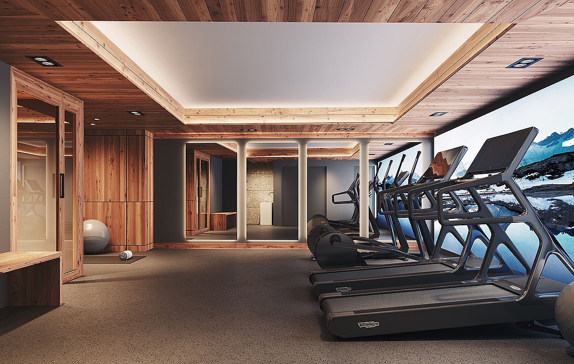 The apartment features both a shower room and a bathroom, ensuring comfort for family living or demonstrating strong appeal for seasonal rentals. A ski locker, cellar, and private garage complete the property, while residents enjoy access to shared wellness facilities including a fitness room, sauna, and hammam.
