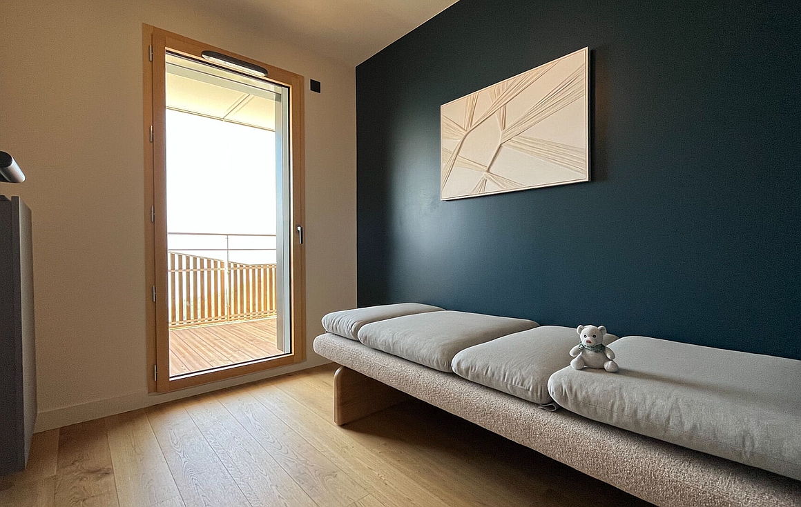 Designed with clean architectural lines and noble materials, the interior blends contemporary comfort with authentic mountain character. The bright living area is bathed in natural light and opens onto a generous south-facing balcony, inviting long lunches and peaceful moments outdoors throughout the seasons. The layout has been thoughtfully designed to balance shared living and privacy, with three well-proportioned bedrooms, a bathroom with WC, and two additional shower rooms, ideal for family stays or hosting guests.