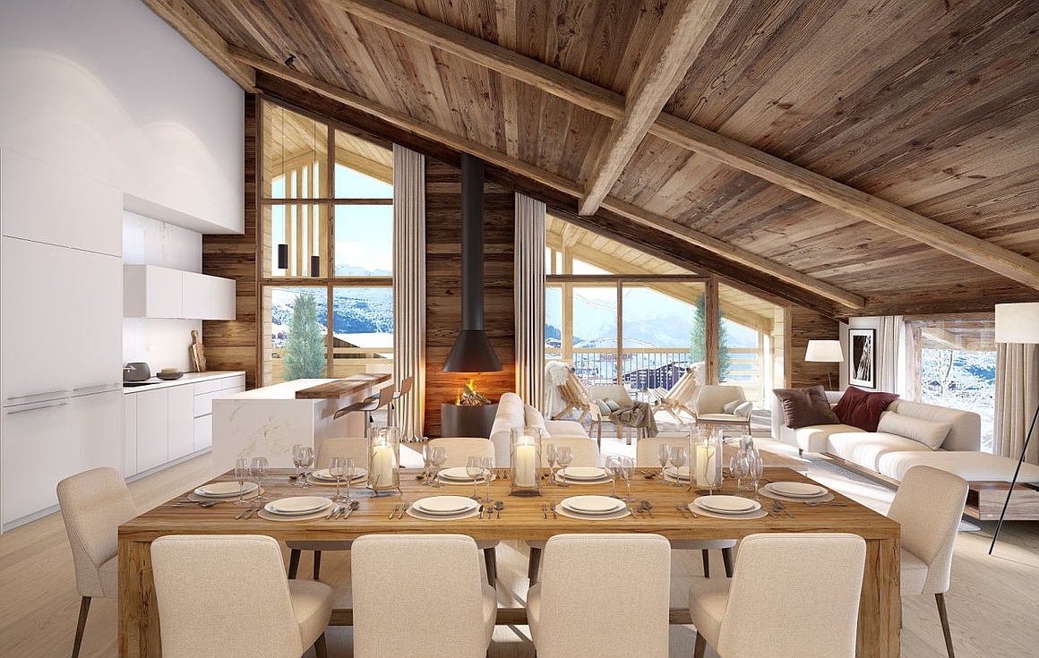 From the entrance, the layout flows effortlessly. An independent WC and shower room lead into a bright 33 sq.m open-plan living area, where a fully equipped kitchen blends seamlessly with the lounge. The atmosphere is warm, contemporary, and thoughtfully designed for both comfort and convivial moments with family or friends. Large openings connect the interior to the terrace, extending the living space outdoors and inviting you to enjoy the alpine surroundings year-round.