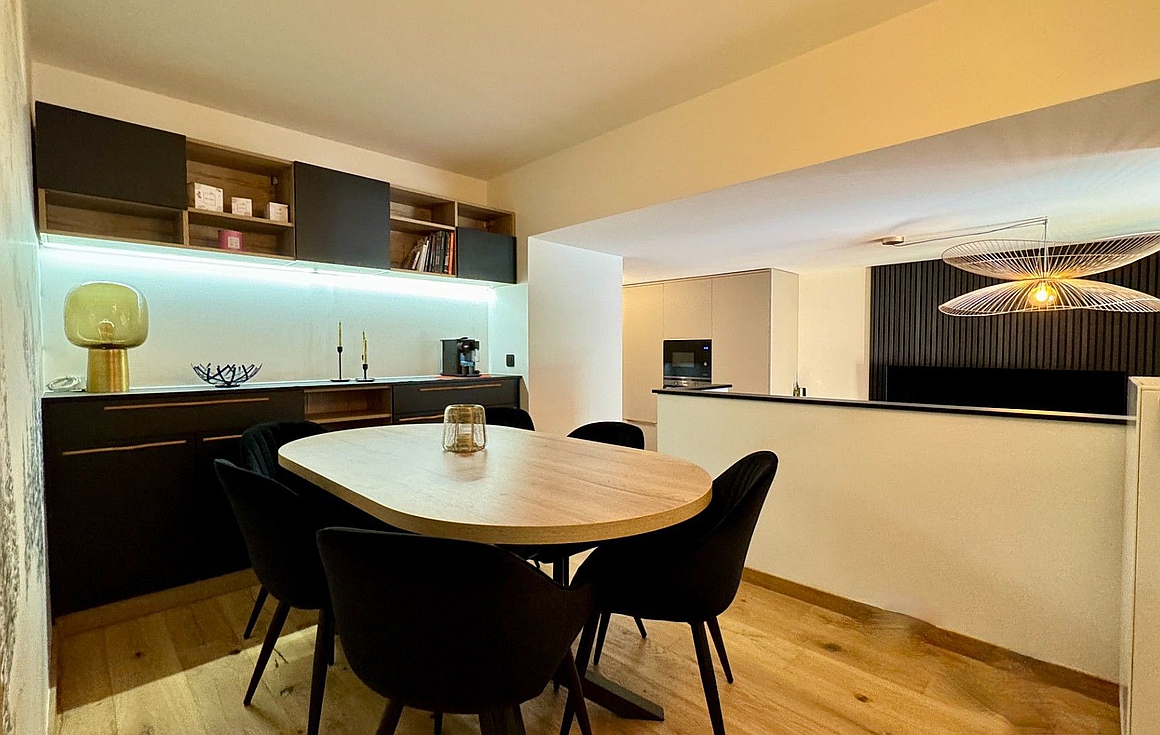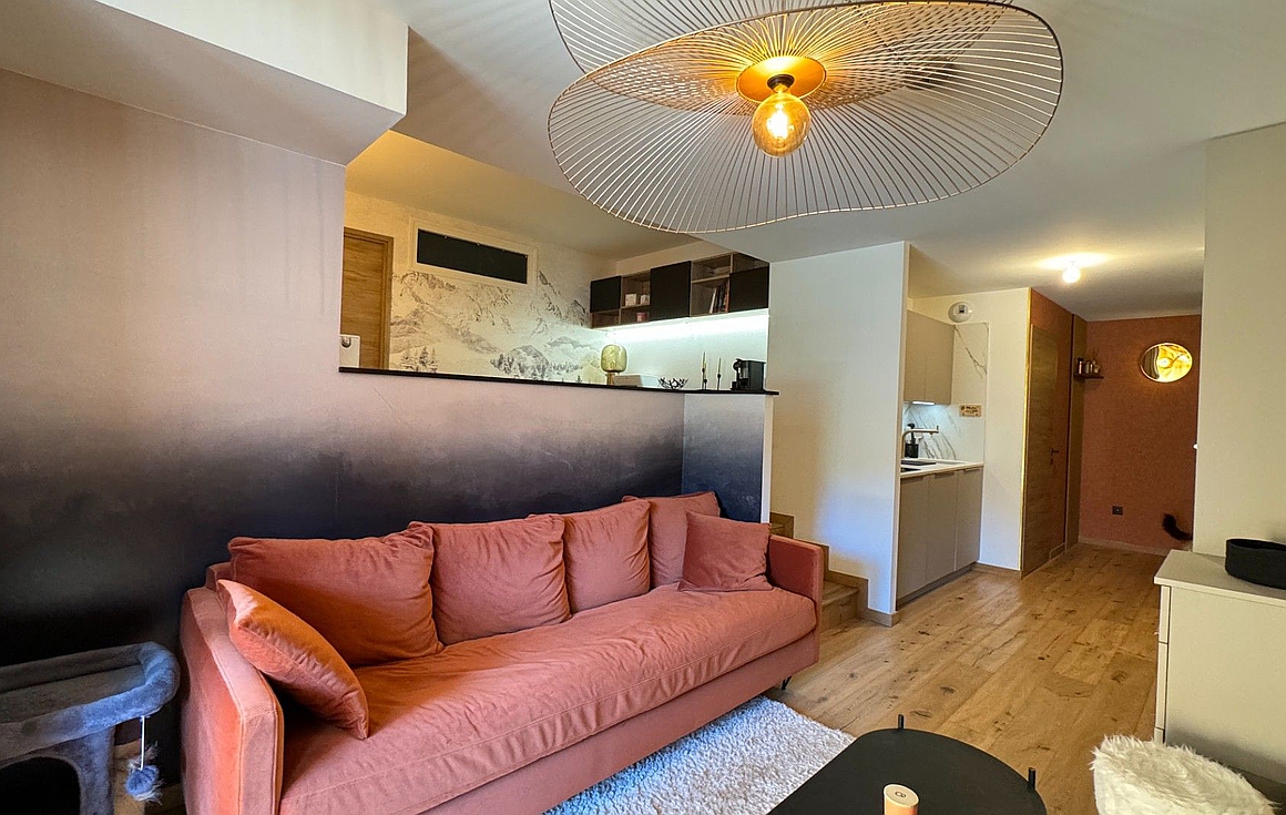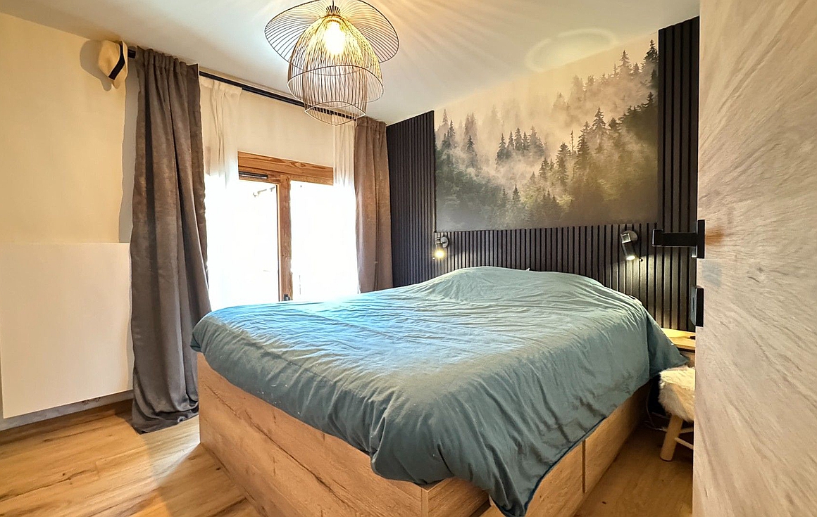 The apartment features a spacious living room with a cozy lounge area, dining space, and direct access to a terrace—the perfect spot to relax after a day on the slopes. The fully equipped open-plan kitchen is ideal for preparing meals, while the sleeping area includes a comfortable double bedroom and a mountain cabin bedroom with bunk beds, perfect for accommodating family or friends. A modern shower room and two separate WC complete the layout.