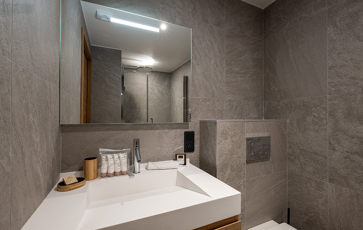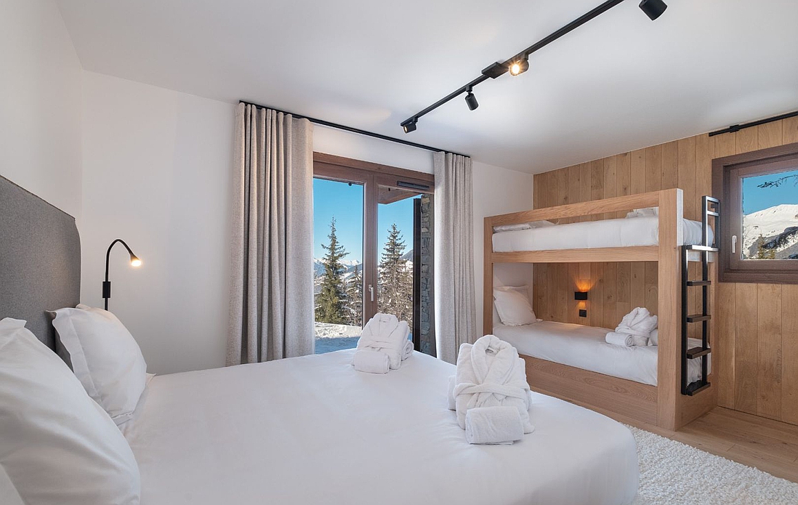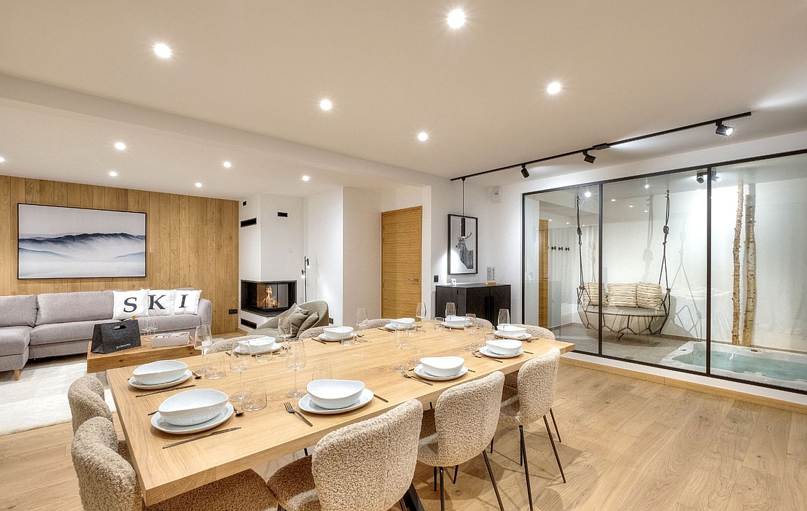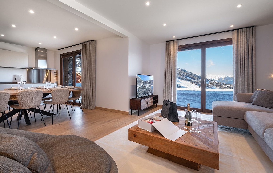A private terrace extends the living area outdoors, offering a quiet setting to unwind while taking in the alpine atmosphere. Within the residence, premium amenities such as a jacuzzi add a discreet touch of wellness, while practical features including an elevator, ski locker, and outdoor parking enhance everyday convenience.