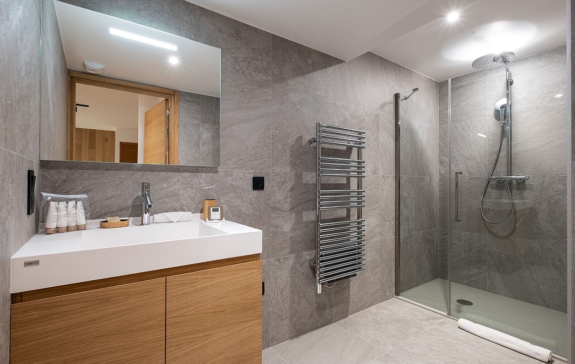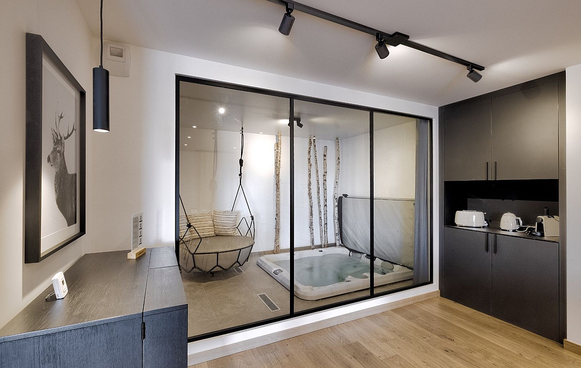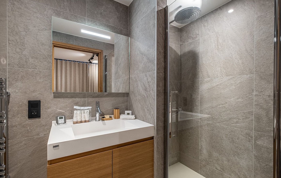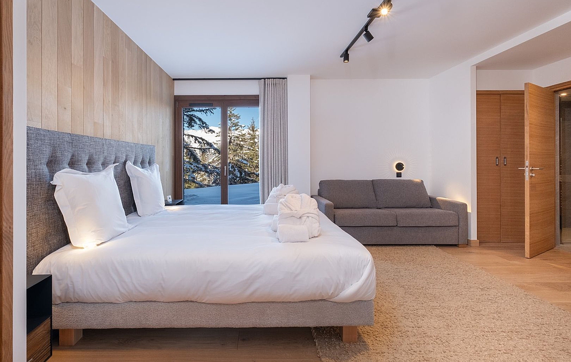 A private terrace extends the living area outdoors, offering a quiet setting to unwind while taking in the alpine atmosphere. Within the residence, premium amenities such as a jacuzzi add a discreet touch of wellness, while practical features including an elevator, ski locker, and outdoor parking enhance everyday convenience.