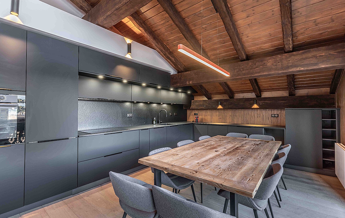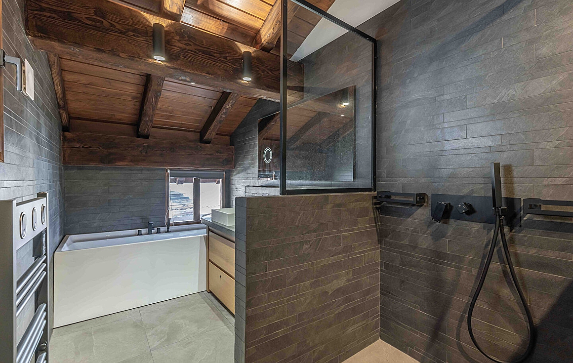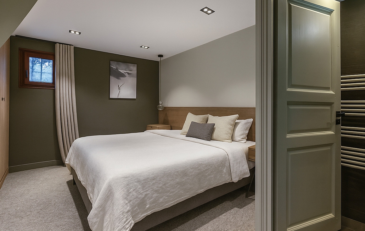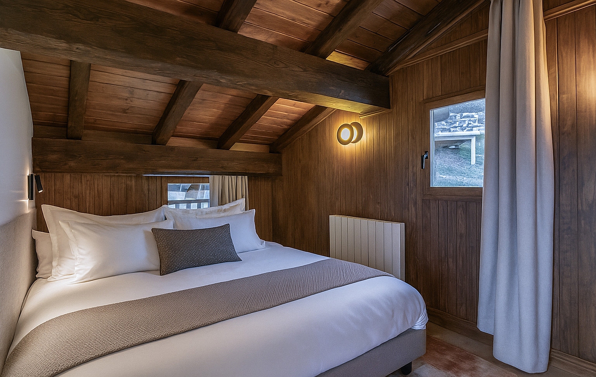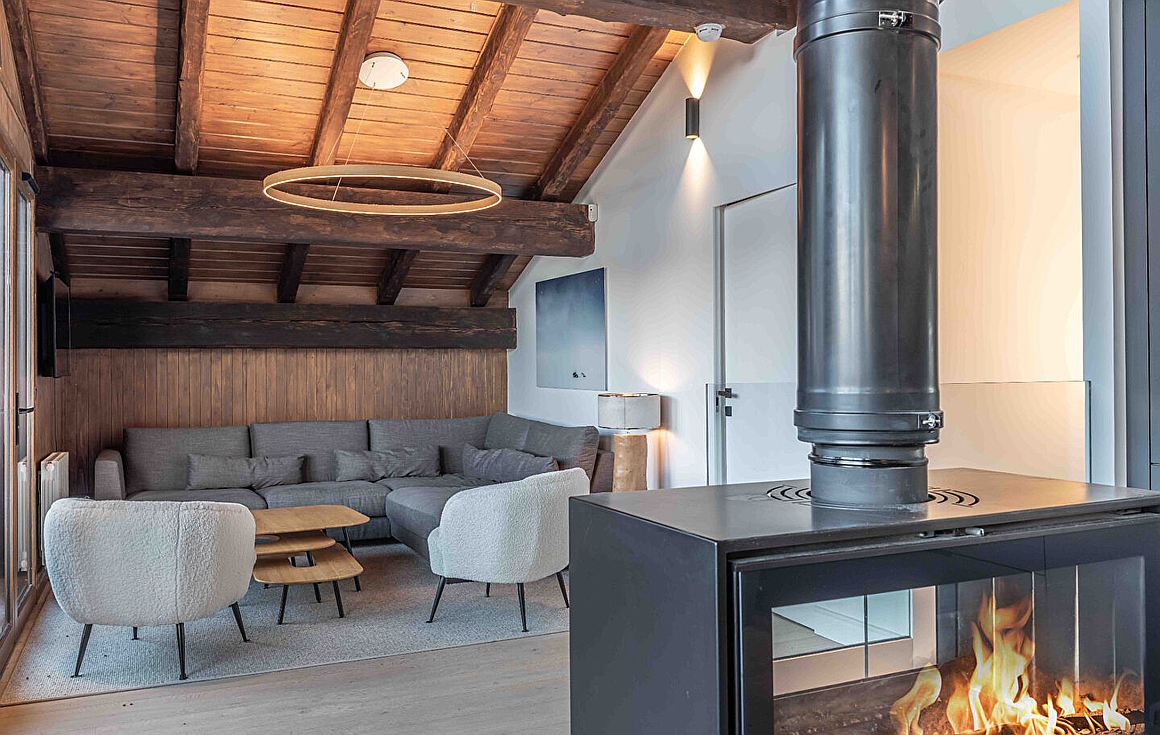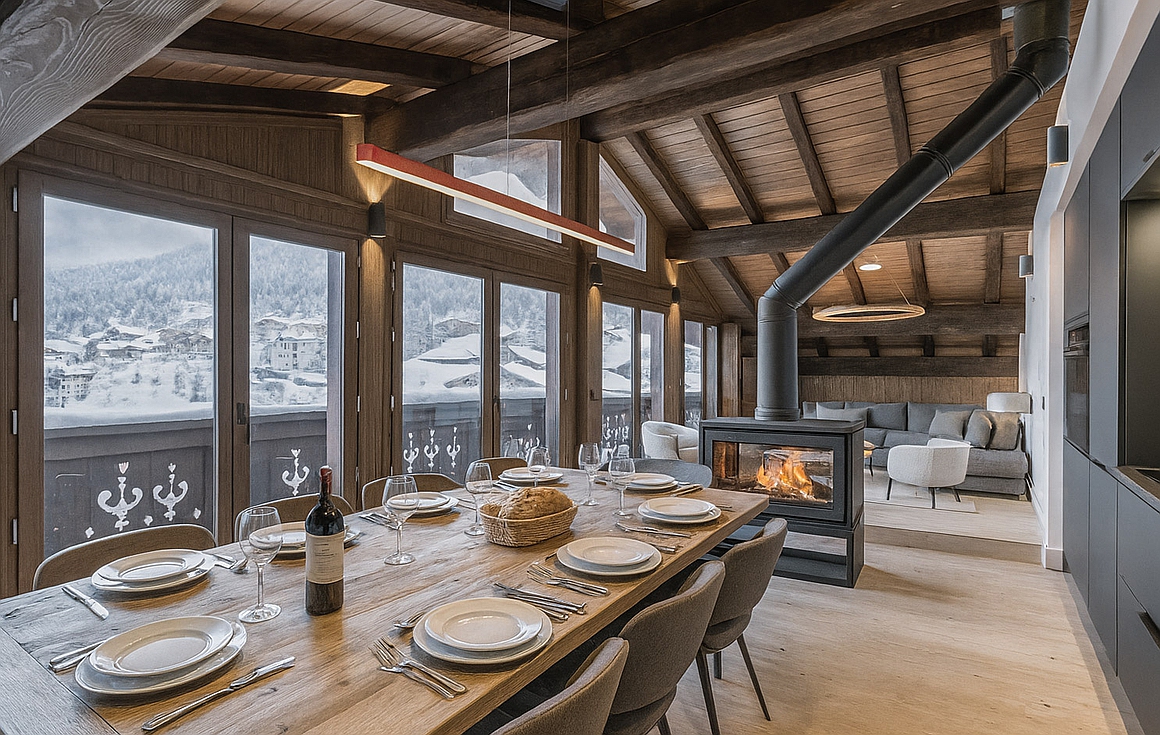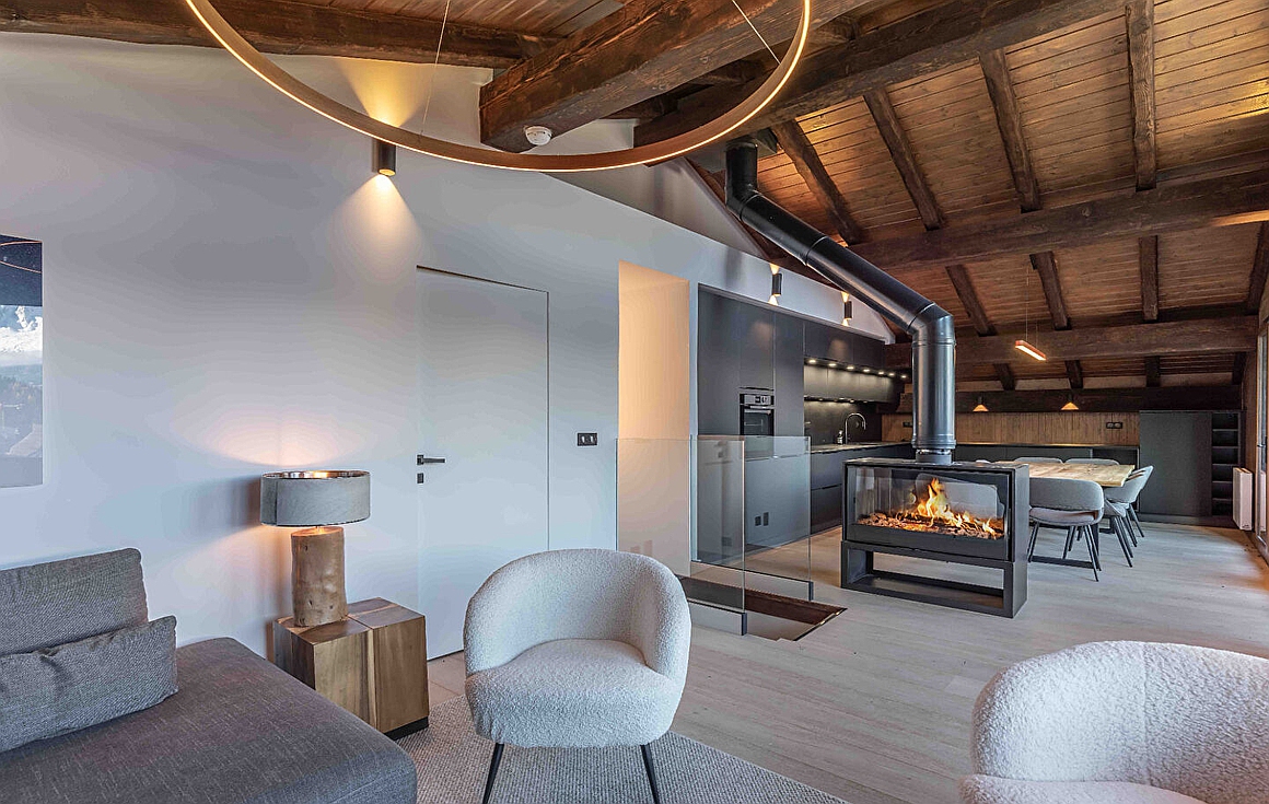 The main living spaces are warm and inviting, centred around a fireplace that creates a cosy atmosphere after a day on the slopes. Large openings flood the interiors with natural light, while the terrace extends the living experience outdoors, perfect for morning coffee or sunset moments in the mountains. The chalet is thoughtfully laid out to accommodate families and guests with ease, featuring five bedrooms with private bathrooms and shower rooms, ensuring optimal comfort for everyone.
