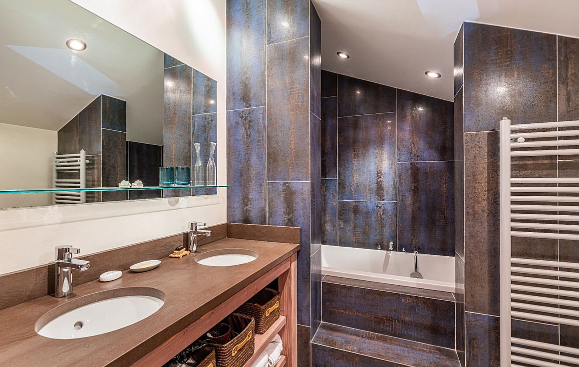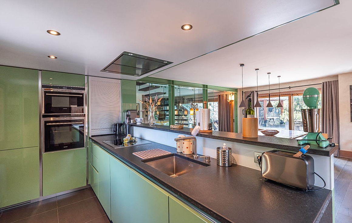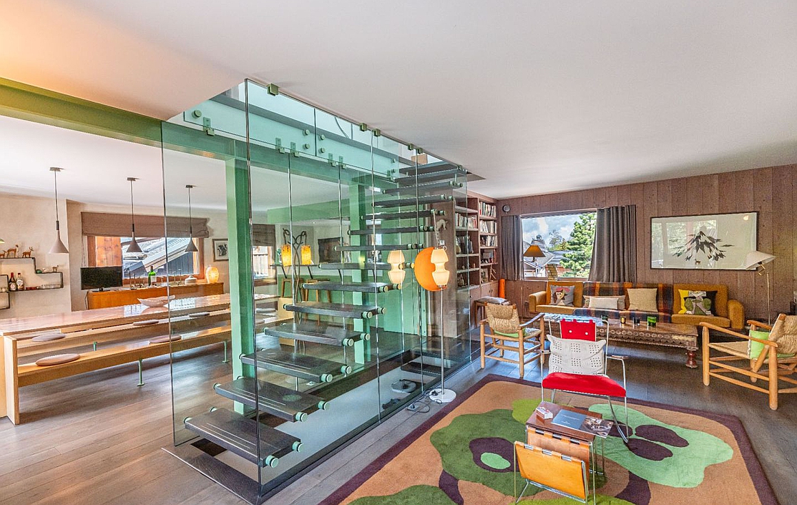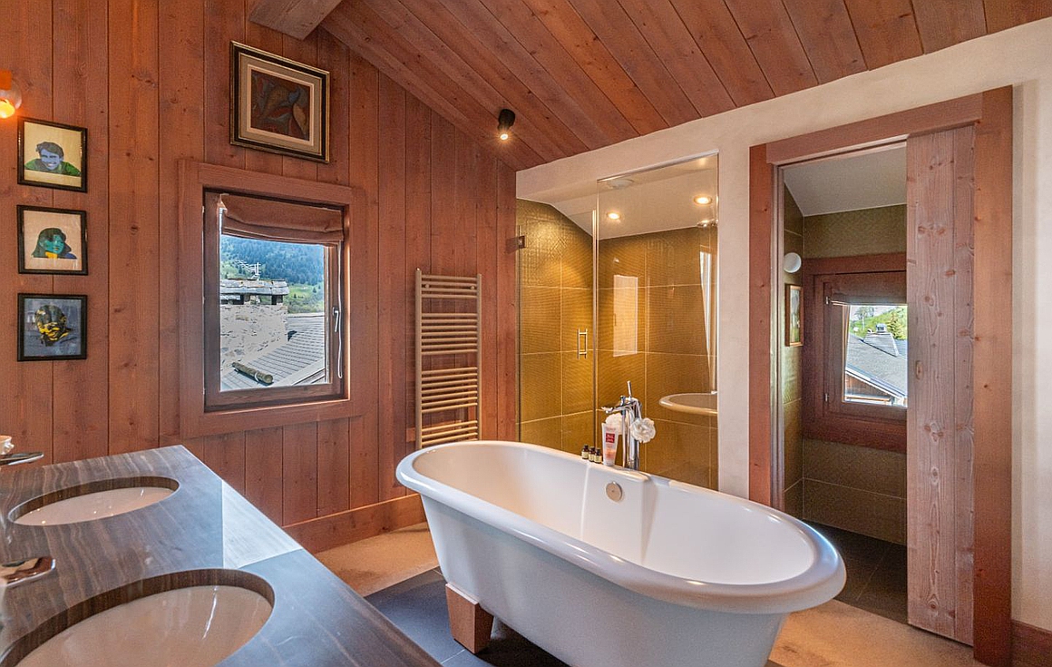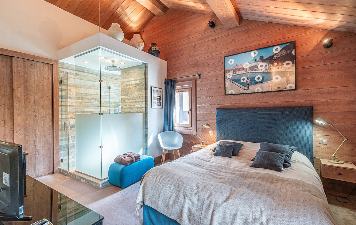 The chalet’s spacious living room is divided into two distinct areas, featuring a beautiful fireplace that opens onto a wooden terrace for seamless indoor/outdoor living. Each of the six en-suite bedrooms includes a bathroom or shower room, offering optimal comfort.