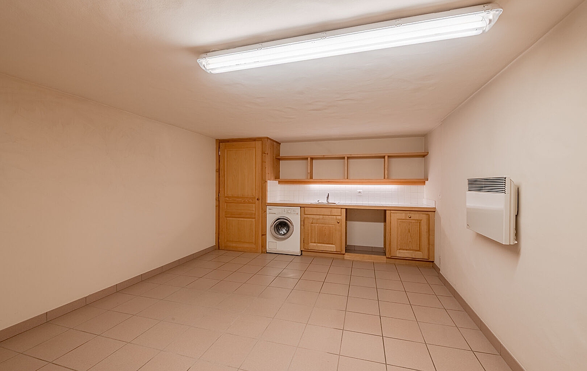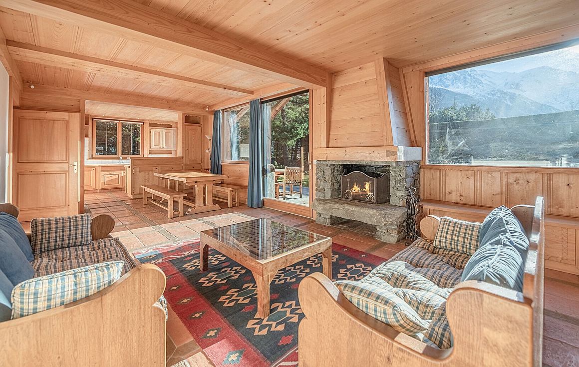Designed across multiple levels, the chalet opens onto a welcoming entrance hall leading to a generous living and dining area. Large openings flood the interiors with natural light, while the fireplace brings warmth and authenticity to the space. The open-plan fitted kitchen connects seamlessly to the living area, creating an inviting setting for shared moments with family and guests.
