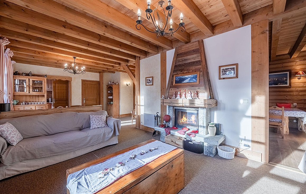 The bright main living area opens gracefully onto the terrace and garden, creating a seamless connection between indoors and the surrounding Alpine landscape. A welcoming lounge with fireplace forms the heart of the home, complemented by a dining area and an independent fully equipped kitchen with direct outdoor access.