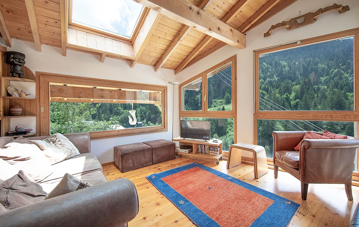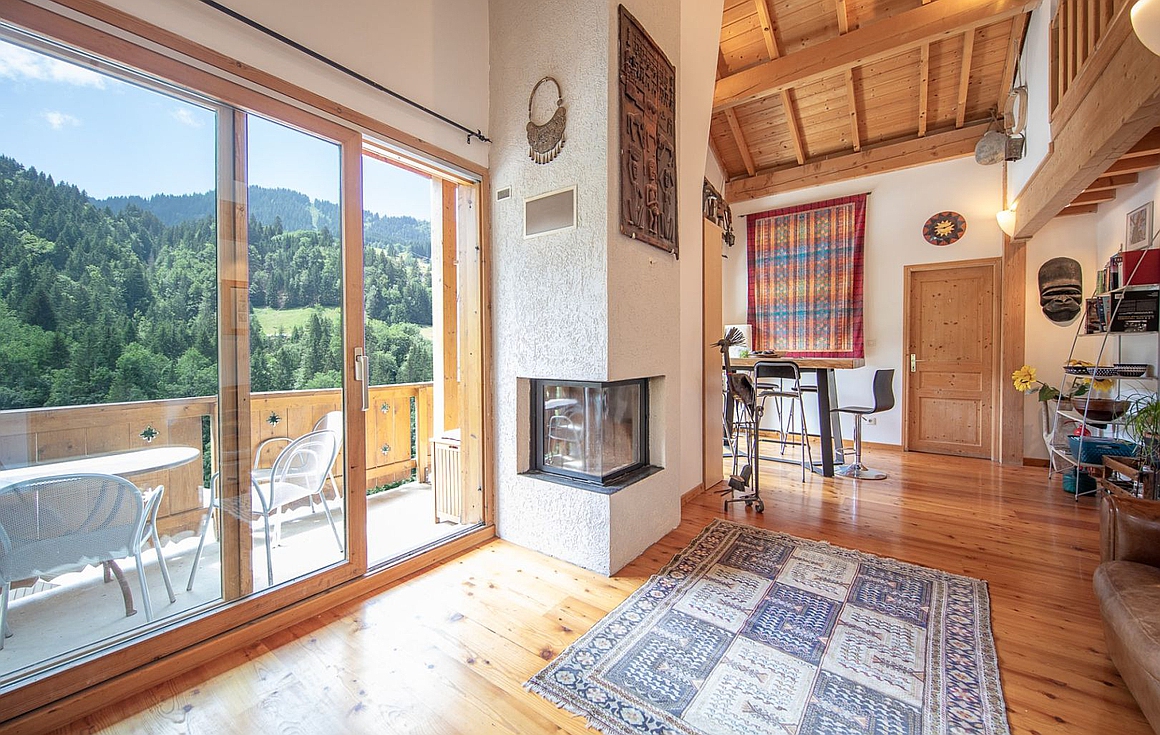 The main living area is bright and inviting, centred around a fireplace and enhanced by large windows that flood the space with natural light. This level opens onto a sunny balcony, perfectly oriented to enjoy the views, while a mezzanine above creates a unique dining area overlooking the living space.